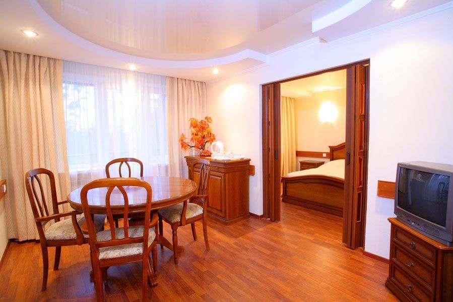 В корпусе: лечебная база, кинозал, столовая, бар, танцевальный зал, бильярдная, библиотека.