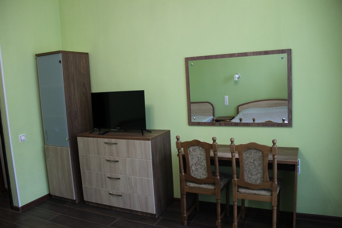 В номере: двуспальная кровать, прикроватные тумбы, стол, стулья, шкаф, тахта, телевизор, холодильник, электрочайник, утюг с гладильной доской, сушилка для белья, набор посуды
