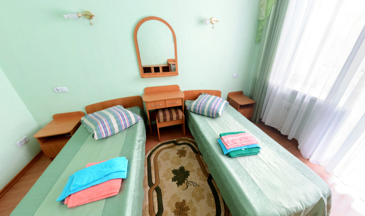 В номере: вешалка, зеркало, кровати односпальные, прикроватные тумбочки, стол, стулья, шкаф встроенный, мини-холодильник, набор посуды, телевизор