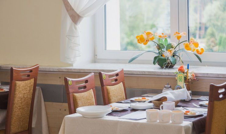Столовая, с двумя уютными обеденными залами на 500 посадочных мест, расположена в главном корпусе санатория на втором этаже. В санатории организовано пятиразовое питание в одну смену, а для больных сахарным диабетом и лиц, нуждающихся в частом и дробном питании, предлагается дополнительный завтрак в 11:00 часов.