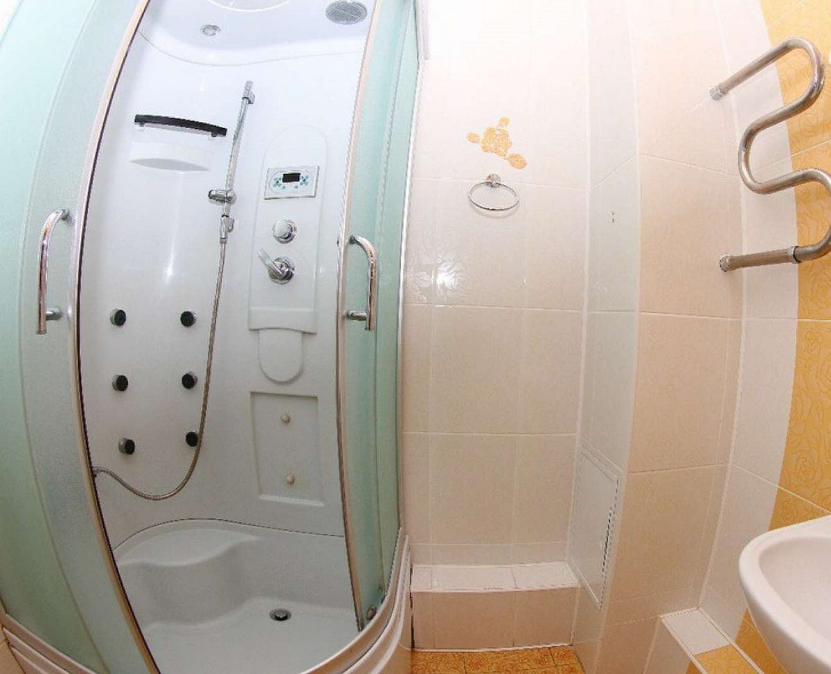 Санузел: душевая кабина, душ, раковина, унитаз, туалетные принадлежности