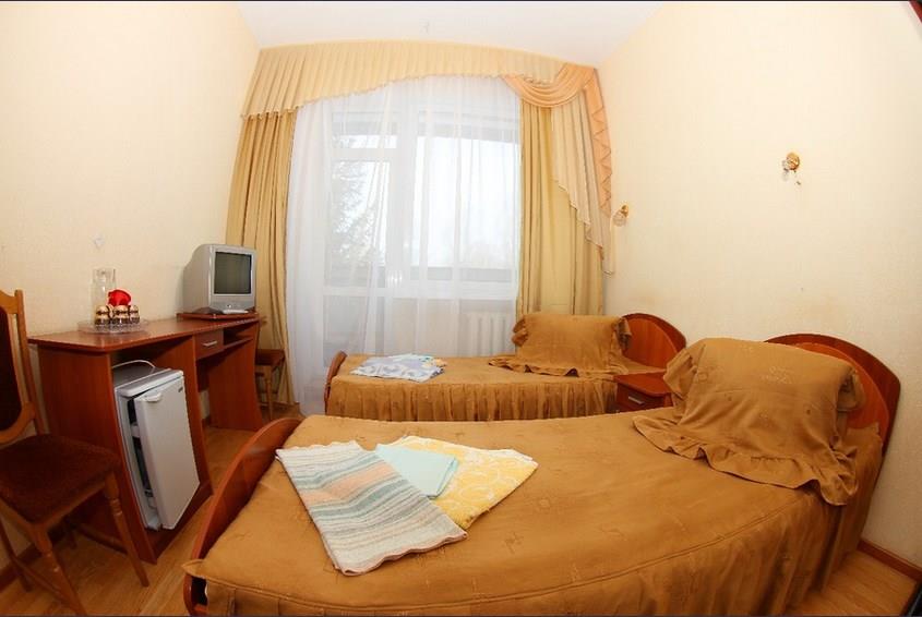 В номере: две кровати односпальные, прикроватные тумбочки, стол, стулья, шкаф-купе, набор посуды, телевизор, холодильник