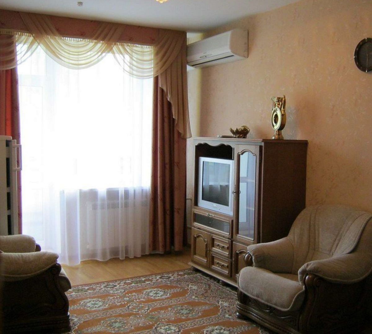 В номере: две комнаты: спальня и гостиная, кровать двуспальная, прикроватные тумбы, стол, стулья, шкаф, набор мягкой мебели, кондиционер, набор посуды, телевизор ЖК, утюг, холодильник, электрочайник