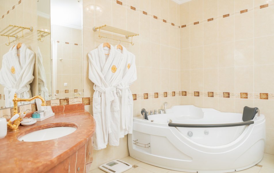 Санузел: джакузи, ванна, душевая кабина или ванна, раковина, унитаз, фен, тапочки, туалетные принадлежности